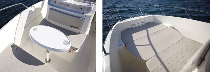 Une table pique-nique, un mât de ski et des porte-cannes en font un bateau particulièrement polyvalent. Le déplacement est facile autour de la console et les hauts franc-bords sécurisant pour les enfants.