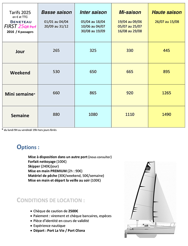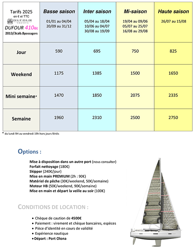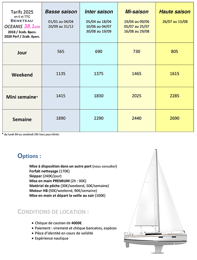 Mise en main et départ la veille au soir (100€) : cette formule vous permet d’appareiller dès votre arrivée la veille au soir du début de la location effective, de manière à gagner quelques milles nautiques sur votre programme de navigation. |